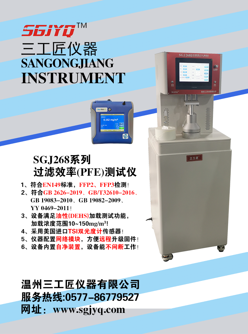 SGJ268系列過濾效率(PFE)測試儀1、符合EN149標準,FFP2、FFP3檢測!2、符合GB 2626-2019、GB/T32610-2016、GB 19083-2010、GB 19082-2009、YY 0469-2011!3、設備滿足油性(DEHS)加載測試功能,加…