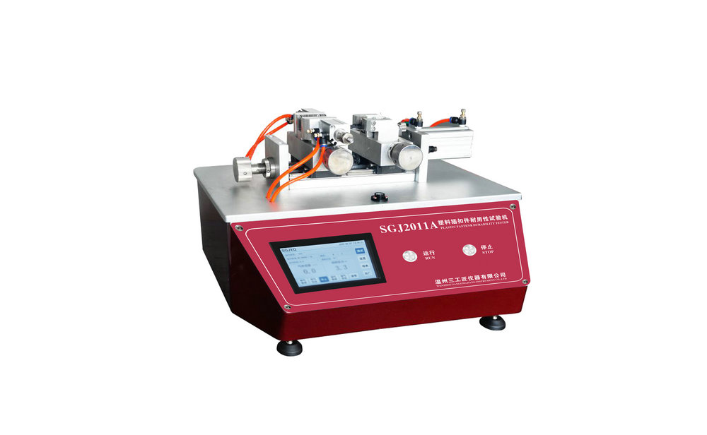 儀器用途:用于塑料插扣反復耐疲勞性測試,采用觸摸屏顯示,氣動式結構,依據試驗規范制作,測試方法為將行李箱扣環固定于機臺上,調整扣環行程持續測試若干次數后,目視扣環有無損壞。